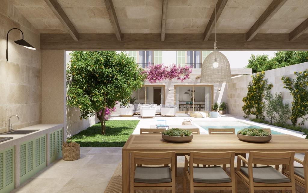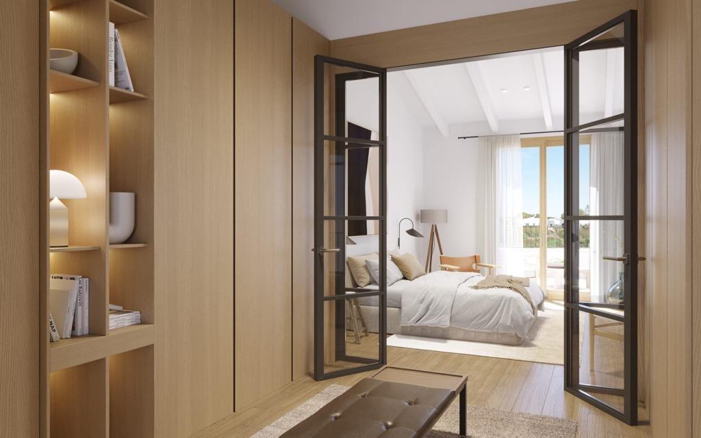 Acabados de Alta Calidad: Carpintería exterior con rotura de puente térmico, persianas mallorquinas de madera, suelos y fachadas de piedra natural de Santanyí, puertas y armarios empotrados de roble, y vigas vistas. Grifería, bañeras y duchas de primeras marcas, además de un avanzado sistema de cámaras de seguridad.