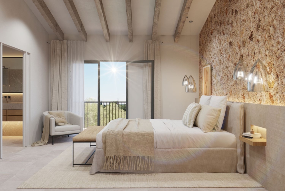 La suite principal destaca por su generoso espacio, su vestidor privado y una terraza exclusiva con vistas únicas a la iglesia del pueblo