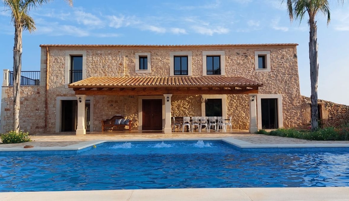 Esta hermosa casa está situada en una zona muy tranquila entre Santanyí y Cas Concos. La casa tiene un amplio salón/comedor y una cocina Bosch equipada. En total hay cinco dormitorios amplios y luminosos, todos con baño en suite.En la zona exterior hay dos porches, un pozo, una sauna con estufa de leña y una piscina con dos jacuzzis integrados.El agua, la piscina y el mantenimiento del jardín están incluidos. Se puede alquilar desde un mes hasta un máximo de 12 meses.